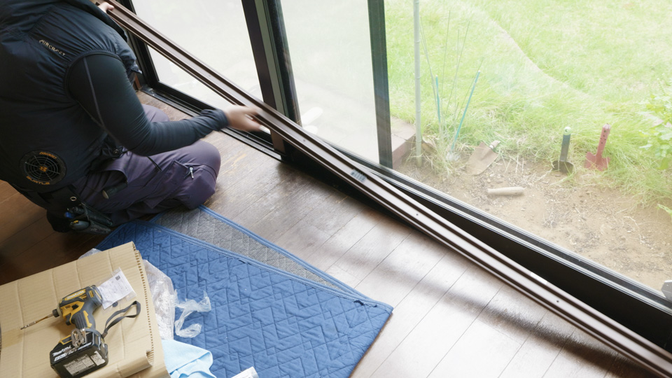 採寸に合わせて製作されたサッシとガラスを取り付けます。襖と同じ要領で、上からはめて、レールに載せます
