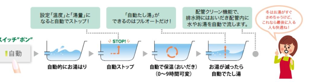 ふろ給湯器には、湯はり機能が異なるフルオートとオートの2つのタイプがあり、使用できる機能が異なります。