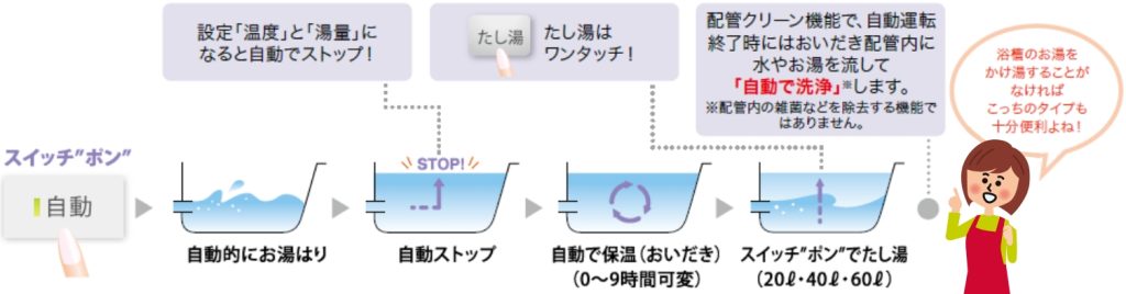 スイッチ“ポン”で設定湯量と温度の湯はりから保温( おいだき)まで自動で行ないます。