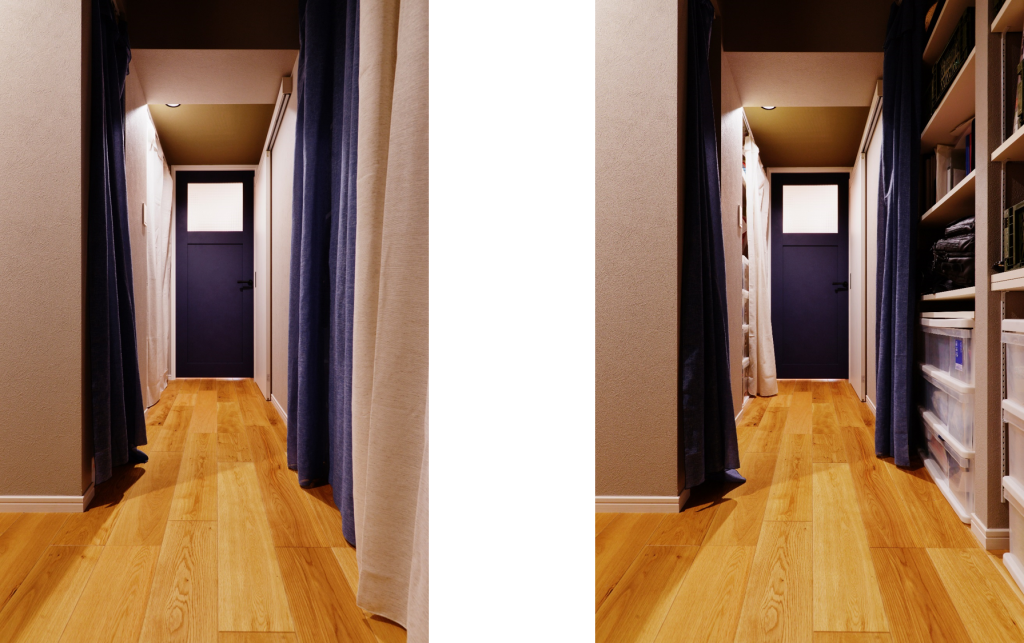 【廊下・収納】右側には衣類を、左側には書類や日用品を収納。玄関から直結しているため宅急便の対応や郵便の整理整頓が直ぐにできます。