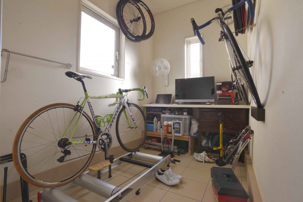 ご主人様:「今では天候に左右されることなく練習ができ、ロードバイク3台を余裕で収納できるだけのスペースがあります。玄関からの動線が完璧で、外を走って帰ってきたらロードバイクの部屋に直行できます。そのままメンテナンスができるので、以前は問題だった、汚れをリビングに持ち込むことがなくなりました。」