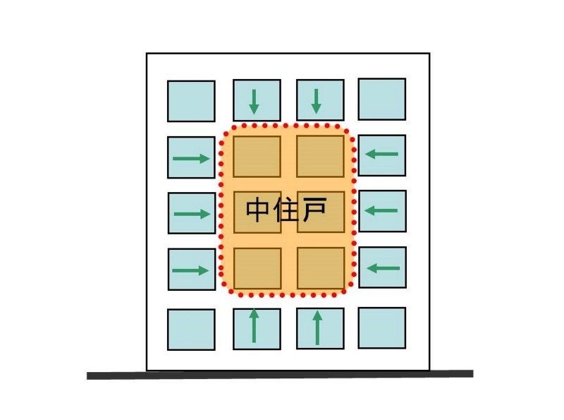 断熱性能や快適性・断熱リノベの費用対効果を考えると中住戸が望ましい最も望ましい住戸は、中住戸です。中住戸というのは、最上階でも最下階でもなく、両サイドに住戸のある場所の住戸のことを言います。一般的には、最上階の妻側(端側)の住戸が最も人気がありますよね。逆にいうと、中住戸は、最も人気がなく、価格的にもお買い得なんです。価格的にお買い得な上に、実は冷暖房の光熱費も安く済み、かつ、健康・快適に暮らすことができる住戸なんです。