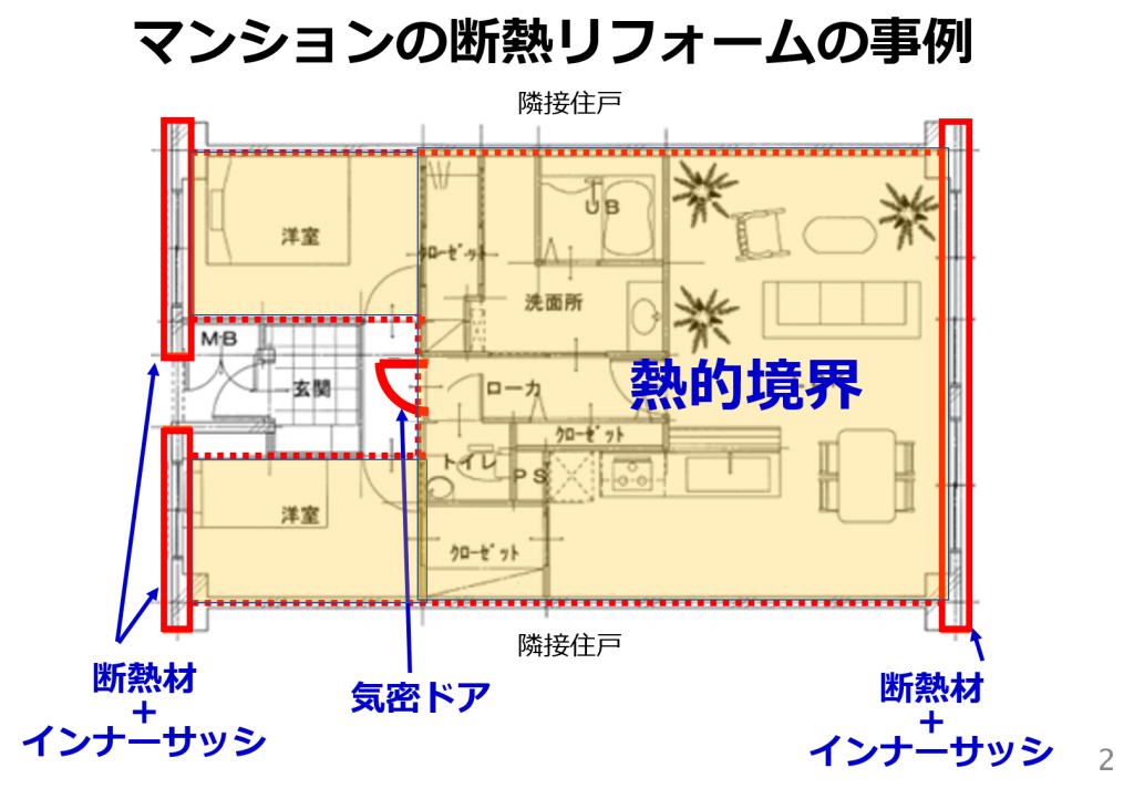 中住戸の場合は、外気に面しているのは、玄関側とバルコニー側だけなので、基本的には、その2面だけきちんと断熱施工すれば、かなり快適になります。
