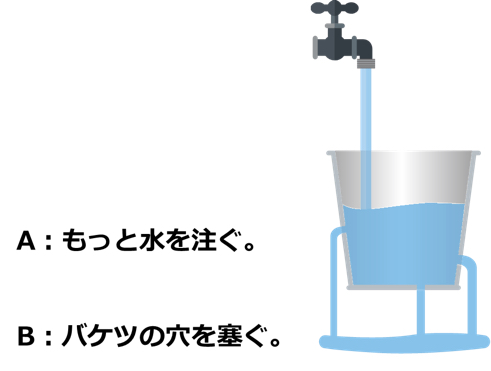 ここに、穴の開いたバケツに水が注がれています。バケツの水位を上げたいのですが、あなたはどうしますか?
