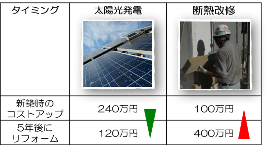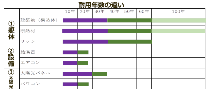 住宅の省エネ性能を向上させるのには、大きく分けると、①躯体性能の向上(断熱・気密性能、日射遮蔽・日射取得)、②設備の省エネ性能向上、③再生可能エネルギー(太陽光発電、太陽熱温水器等)の大きく3つの方法があります。ではなぜ、バケツの穴を塞ぐこと、すなわち断熱・気密性能や日射遮蔽・日射取得性能の向上の優先順位が高いのでしょうか?