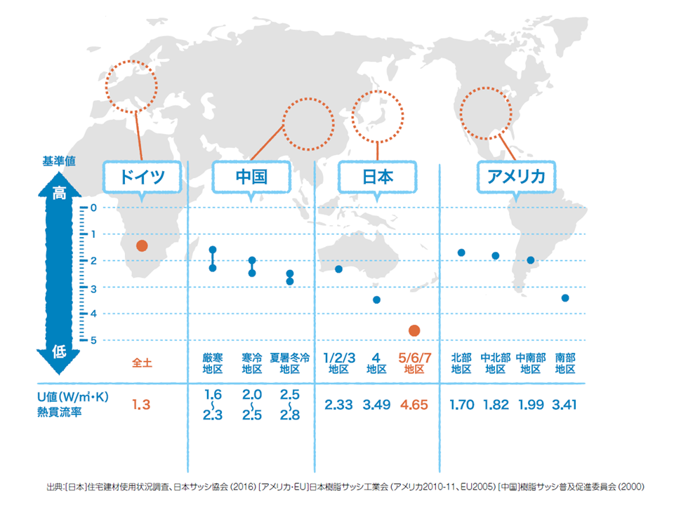 右の写真は、日本で一般的に使用されているサッシとドイツの一般的なサッシの断面です。欧州ではトリプルガラスのサッシが一般的です。断面写真を見るだけで、性能の違いは一目瞭然です。日本のものづくりは進んでいるはずなのですが、残念ながらなぜか窓については、日本のマーケットにおいては先進国の中で最も低い性能のものが主流を占めてしまっています。