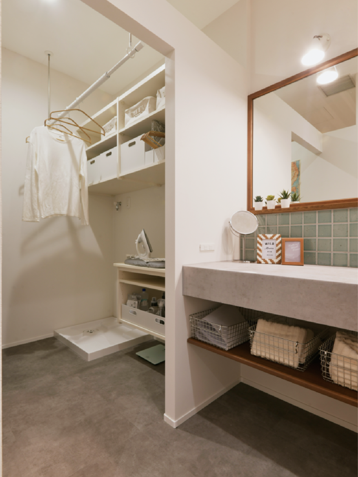 ストレートダイニングのレイアウトで、料理の配膳もスムーズに行えます。開放的なオープン収納と飾り棚は、実用的でありつつも、キッチンをおしゃれに飾ります。キッチンの裏側には洗面・トイレ・ランドリーが連なり、家事がラクに行える動線を確保しています。
