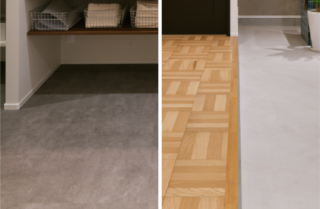 水回りには水や汚れに強いフロアタイルを、キッチンにはパナソニックの高品質パーケットフロアを採用。耐久性と美しさを兼ね備えた材種で、上質な生活空間を提供します。