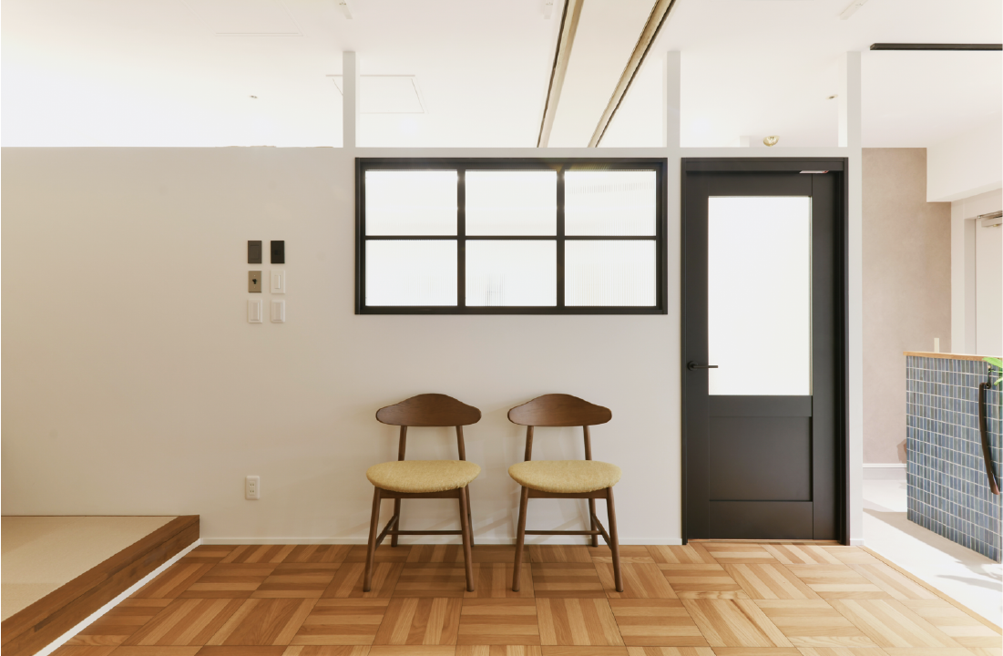 Panasonicの室内窓は、空間を緩やかに繋げる役割を果たし、開放感をもたらします。柔らかな光が差し込むこのデザインは、家族が自然に集まりたくなるような温もりを感じさせます。