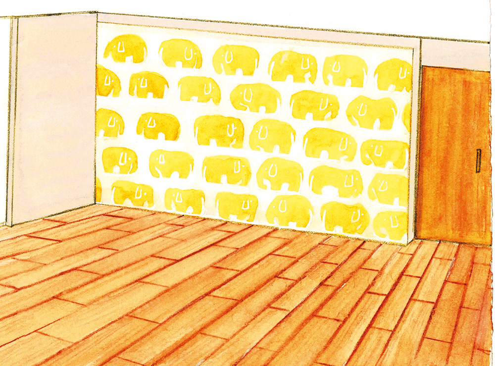 私たちは、お客さまにもっと喜んでもらうべく、パースに猫の絵を入れてみたり、内装には好みの象柄クロスを用いたりなど、ワクワクするような提案を続けていった。それだけでなく、趣味のマンガ本を並べるコーナーをご自身で作りたいとのことだったので、そのためのスペースも用意することにした。