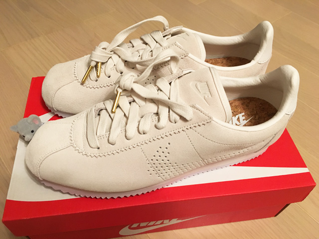 ナイキのスタンダードモデルの一つ「コルテッツ」。これはオフホワイトのスエードに細かいドットの穴でスウォッシュが描かれたバージョン。ドットの下には反射材が敷かれていて、暗闇で光が当たればドットのスウォッシュが現れます(多分)。靴ひもの先がゴールドなのと、インソールがコルクなのもポイント。