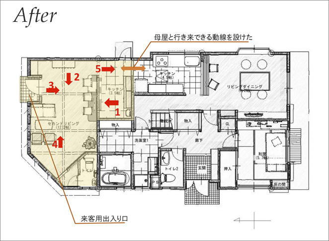 シニア夫婦の今後の生活がいきいきと設計された秀作です。広いだけが求められるLDから、今回は二人の空間に適した程よい大きさに変え、別にサブリビングを設置することで、趣味や集いに合わせた、多用な生活スタイルが創り出されています。また外部との関わりが持ちやすいサブ玄関は思う以上の地域コミュニティを生みだす事でしょう。今回の間取り変更が耐震性の向上をも図り、調質性のある壁塗装や木の温かみが潤いを感しられる、安心して暮らせる楽しい老後に向けた家づくりになっています