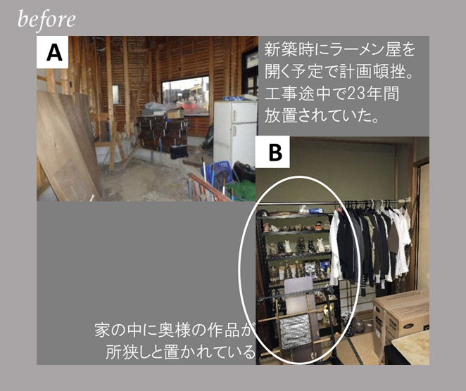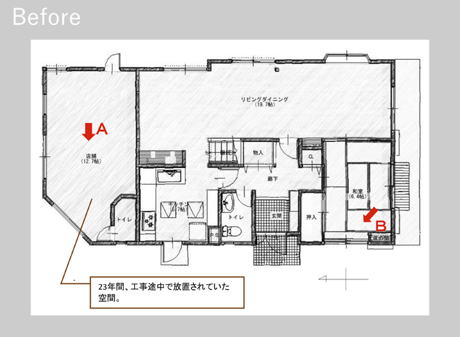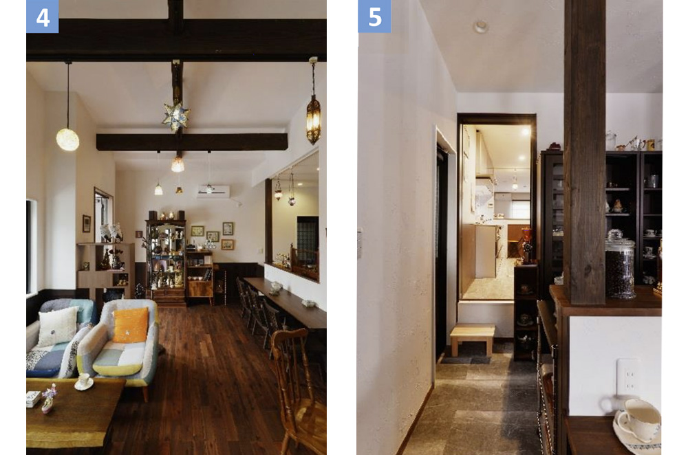 神奈川県川崎市 T様邸 ■建物種別:戸建て 築23年 ■ご家族構成:ご夫婦2人 ■リフォームのきっかけ: 老後に向けて2階にあるUBを1階へ設置したい、というご要望から始まった間取り変更リフォーム。新築時にご主人がラーメン屋を開く計画でそのまま放置されていた空間も取込んでのリフォームを検討されていました。ご主人様の趣味がコーヒー、奥様の趣味が陶芸ということで、趣味を楽しめる空間がほしいとのご要望でした。 ■プラン決定のポイント: 子育ての際に大空間にしていたLDを、夫婦2人の生活に合せて縮小化。水周り間取り変更などと併せてできたスペースに、趣味空間をご提案しました。ご近所さんや趣味仲間が週末気軽に集まれるように、母屋とは別に入口を設け、ラーメン屋仕様だった大きな窓は程よい視線と明るさを通す窓に変更しました。吹抜けが開放的な空間となりました。 ■性能向上で特に配慮した点: 間取り変更耐震補強計画壁は調湿機能のある自然素材で塗装。清掃性、耐久性を考慮し、腰壁と土足用フローリングを採用。 ■施主様のご感想: 将来に向けて水廻りが使いやすくなればと思い相談したリフォームでしたが、無駄にしていた空間をこんな風に活用できるとは思いませんでした。普段は趣味を楽しむ空間として、週末は孫や友人が集まる空間として、色んな使い方をしています。妻の陶芸作品を飾る場所ができ、友人や孫たちにもお披露目できることがとても嬉しく思います。私も自慢のコーヒーを集まった妻の友人たちに出せて、老後のやりがいが見つかった気がします。 ■リフォーム後の至福のひととき: 【リフォーム前】ご主人:コーヒーを淹れているとき/奥様:趣味の工芸をしている時 【リフォーム後】趣味の仲間を呼んで、セカンドリビング(カフェ)でご主人様の淹れたコーヒーを飲みながら奥様の作品を眺めている時。それぞれ個別に楽しんでいた至福の時間を、2人の至福が掛け合わされた空間で仲間と過ごす、にぎやかな時間に! |