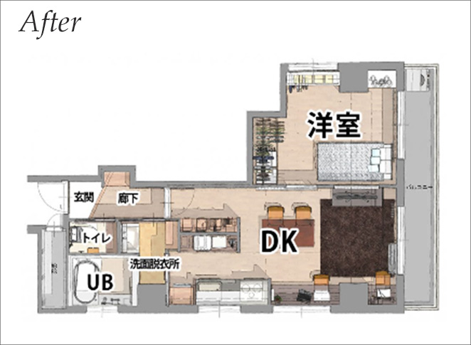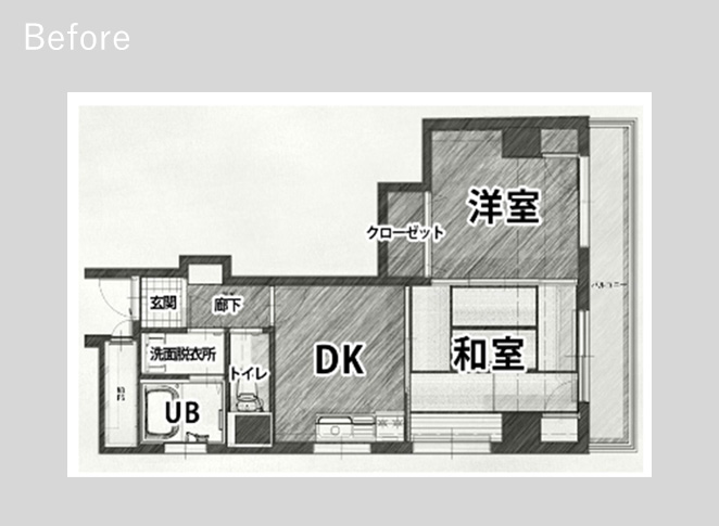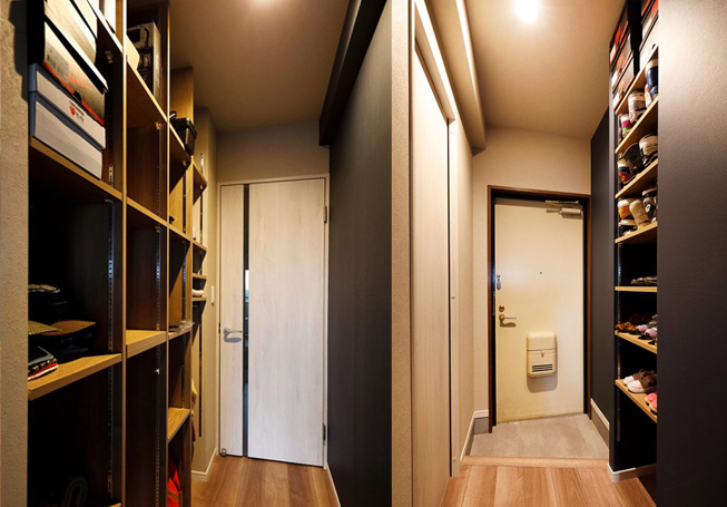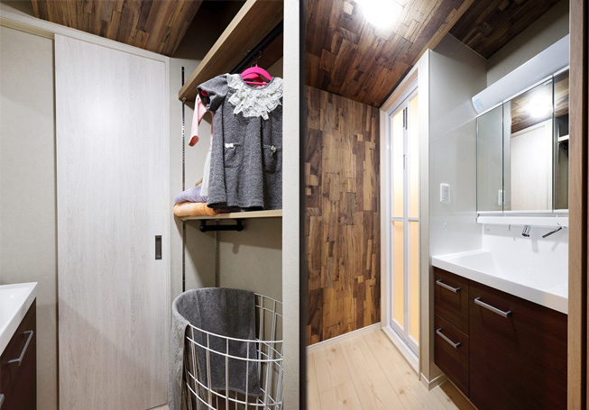 洗面とトイレの位置を入れ替え、回遊動線を実現。また、収納を中心とすることで非常に使いやすくなっている。