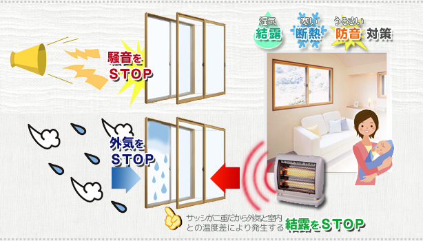 今ある窓はそのままに、内側の木枠に樹脂サッシを直接取り付けます。冷暖房効果を高め、結露を減らす優れた断熱性と高い遮音性能で、1年中快適に過ごせます。