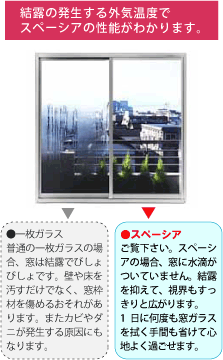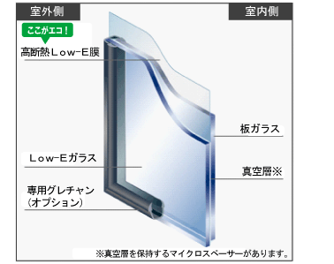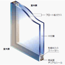 2枚のガラスと中空層で構成される複層ガラスです。1枚ガラスに比べて約2倍の断熱性能があり、お部屋の暖かさを逃がしません。室内側のガラスがあまり冷たくならないので、不快な冷気ゾーンの発生を抑え、ムラの少ない快適な暖房が可能です。