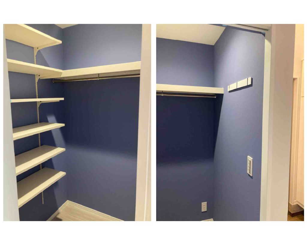 右手上部のスタイリッシュなコート掛けはカワジュン製。内装もこだわりのブルーをチョイスしています。コンセントがあるのも便利です。