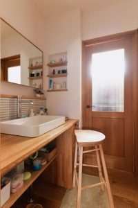 ▽無垢材を使った洗面は、壁と鏡下部の2つのニッチとラインを揃えることにこだわり、美しく仕上げました。