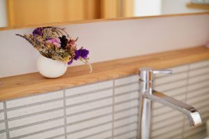 水栓の上端とニッチのカウンター面。鏡の下端と壁のニッチのカウンター面。細かいところですが、揃うと美しい。