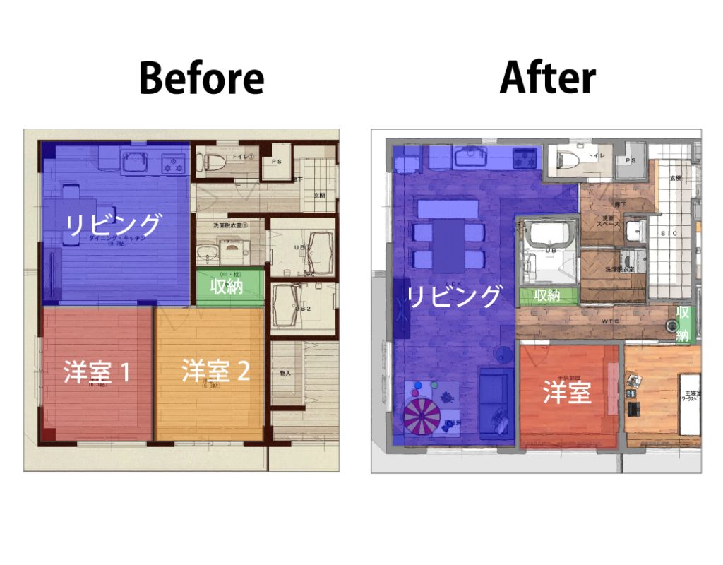 キッチンは対面化させようと悩みましたが、どうしてもリビングの空間を狭めてしまうため、あえて壁付けにすることで広々とした空間を確保。洋室2つのうち一つをリビングに取り込み、使いずらかった押し入れの収納は分散させることで、使い勝手が良くなりました。