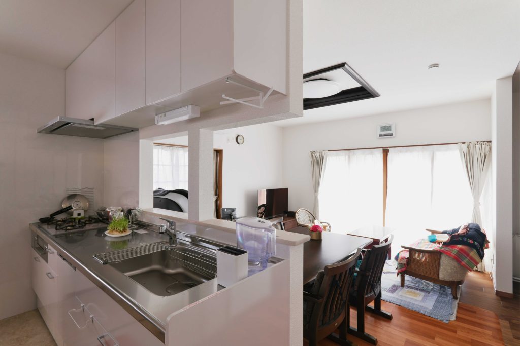 二世帯住宅が世代交代し、今度はお母様と娘様ご家族が同居される二世帯住宅に生まれ変わりました。今まで1階と2階の両方にあったキッチンは1階のみにして、ご家族全員が集まるLDKとなりました。独立型のキッチンから対面キッチンをご希望されましたが、吊戸棚は必要で構造上取れない柱もあったので、適度に壁面もあるキッチンとなりました。