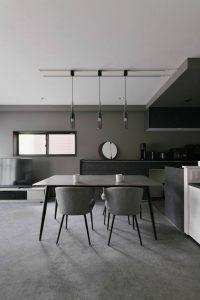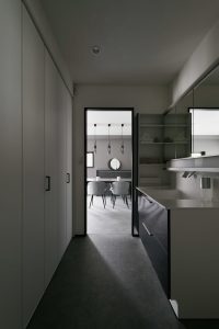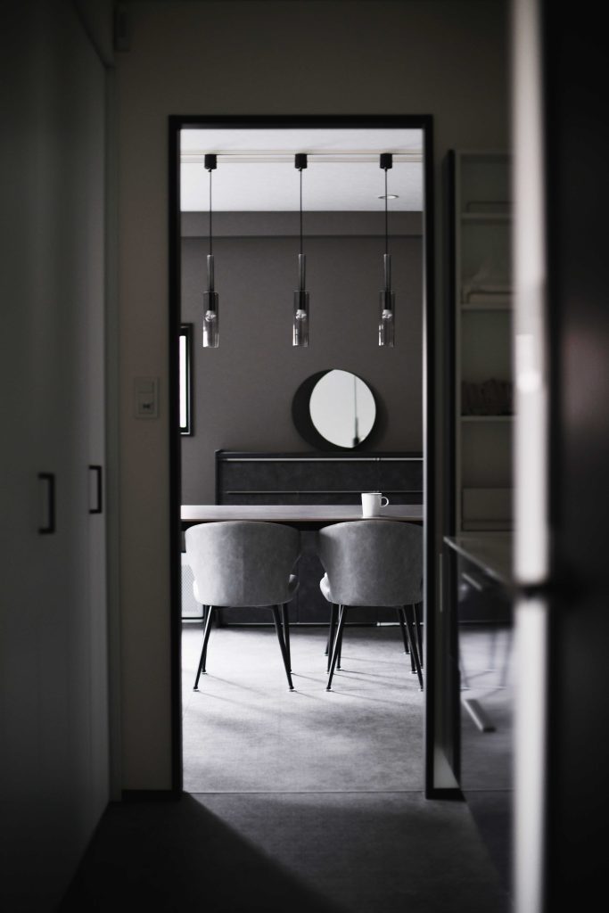 モノトーンのインテリアの空間が上手くまとまるよう、ホワイト・グレー・ブラックのカラーバランスを工夫。シャープな印象を出すため、シンプルなライン(線)を意識した。