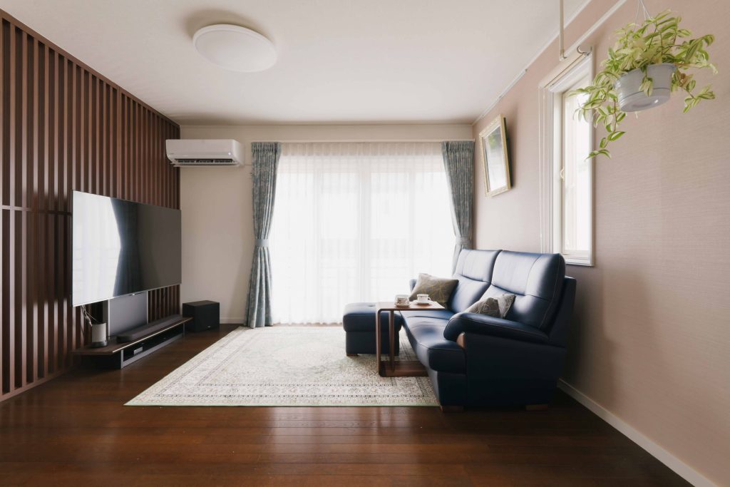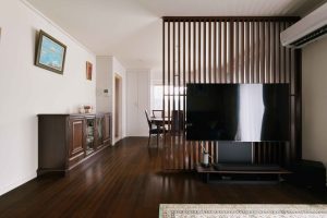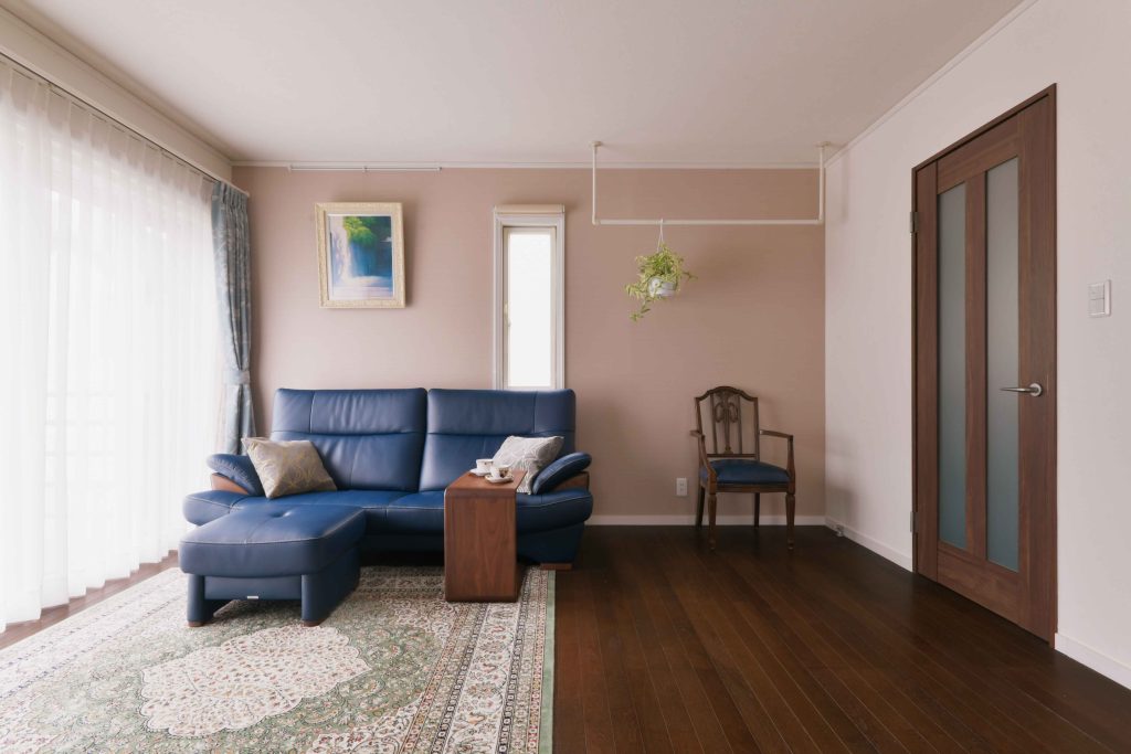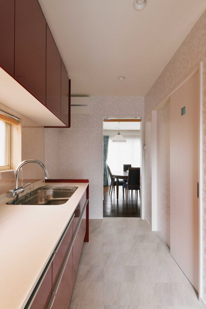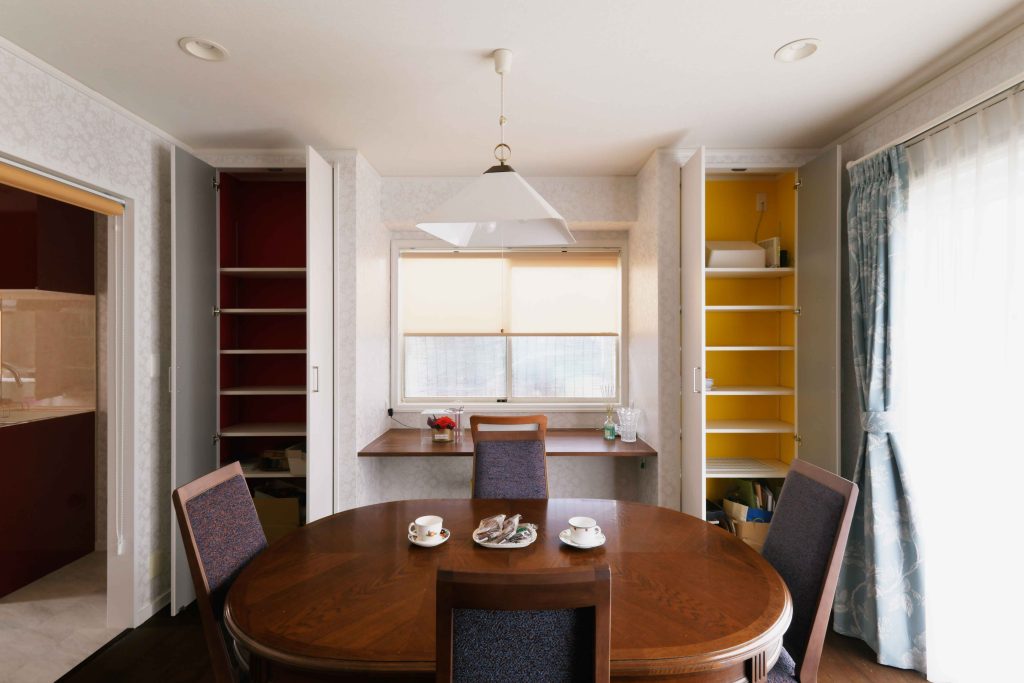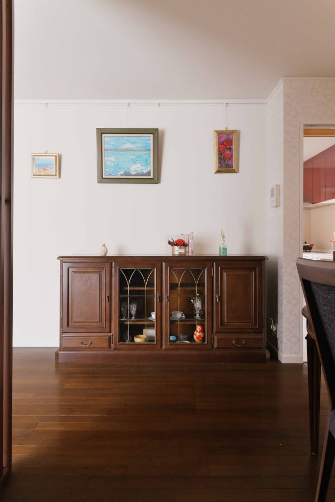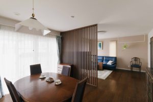 当初はキッチンをリビング側に移す計画もしておりましたが、打ち合わせを重ね、リビングを広く使いたいということでキッチンは移設せずに気に入っているフローリングを残し収納を増やしました。また、リビングとダイニングの間に間仕切り格子を建てることによって程よいつながり、ほどよい目隠しになりました。