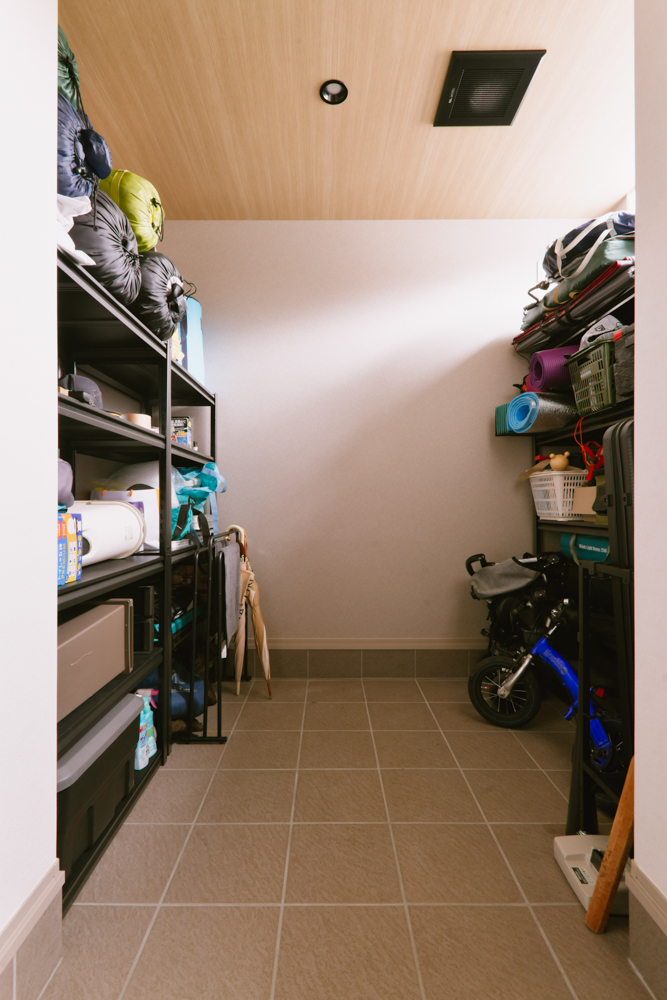 アウトドアグッズを気兼ねなく置くことができる土間収納は絶対やりたかったことの一つ。