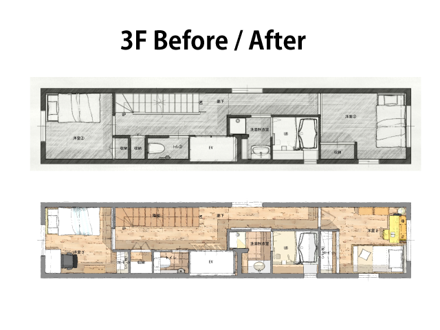 鉄筋コンクリート造3階建ての店舗併用住宅──その居住スペースの改装をお手伝いしました。建物特有の細長い形状と、階段・エレベーターへのアクセス確保により、自由に使える居室スペースは限られていましたが、空間を最大限に活かす工夫を随所に盛り込んでいます。2階のトイレをなくし、家族全員分の個室を確保。2階廊下にあったキッチンを移設・交換し、コンパクトなLDKを新設。床材は全体を通して「MSX-Lシリーズ」を採用。LDKと各寝室で異なる柄を選びつつ、低彩度トーンで統一感のあるコーディネートに仕上がりました。
