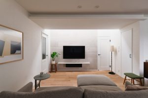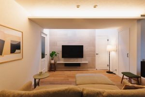 TV背面のエコカラットを際立たせる間接照明。