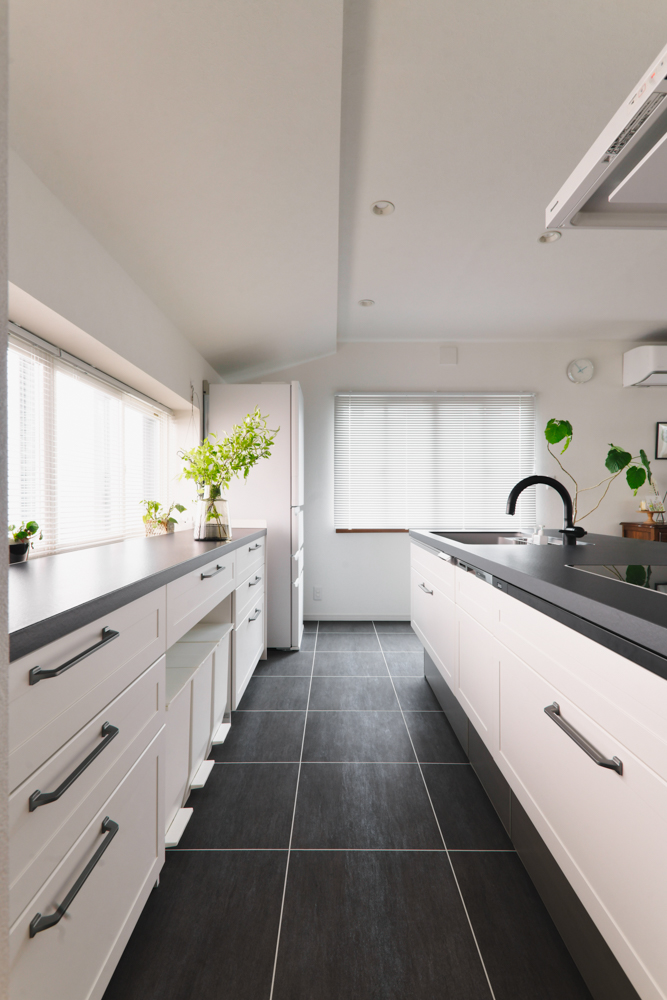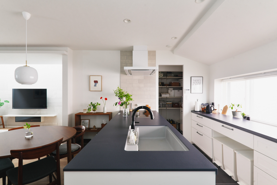 対面キッチンと開放的なリビングを実現するために、廊下をリビングに取り込む形で間取りの変更を行いました。