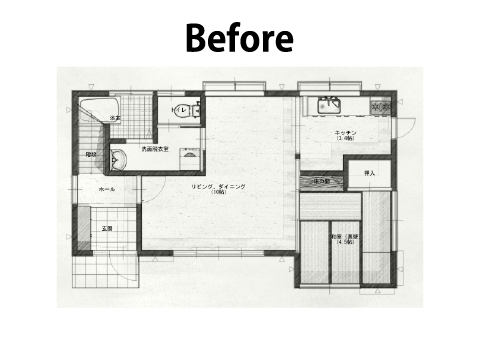 水廻りを大幅に移動することで、「キッチンの閉鎖感の軽減」と「寝室スペースを1階に設ける」という2つのご要望を叶えることができました。