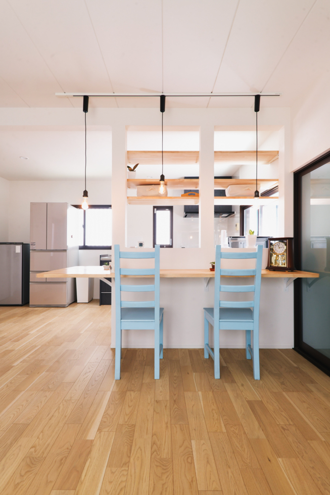 リビングに入ったときの開放感がまるで別の家のようです。特注のダイニングテーブルは家族の時間をより豊かにしてくれます。また、DIYで少しずつ手を加えていけるのも楽しみです。