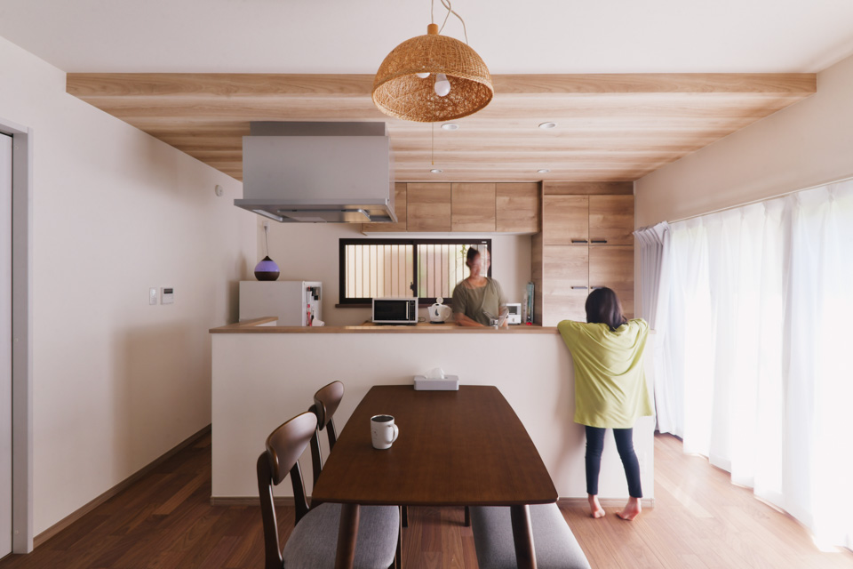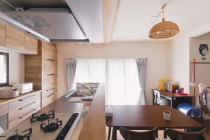 一見すると対面のキッチンですが、キッチンそのものは壁付の仕様のもの。