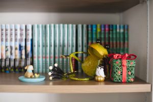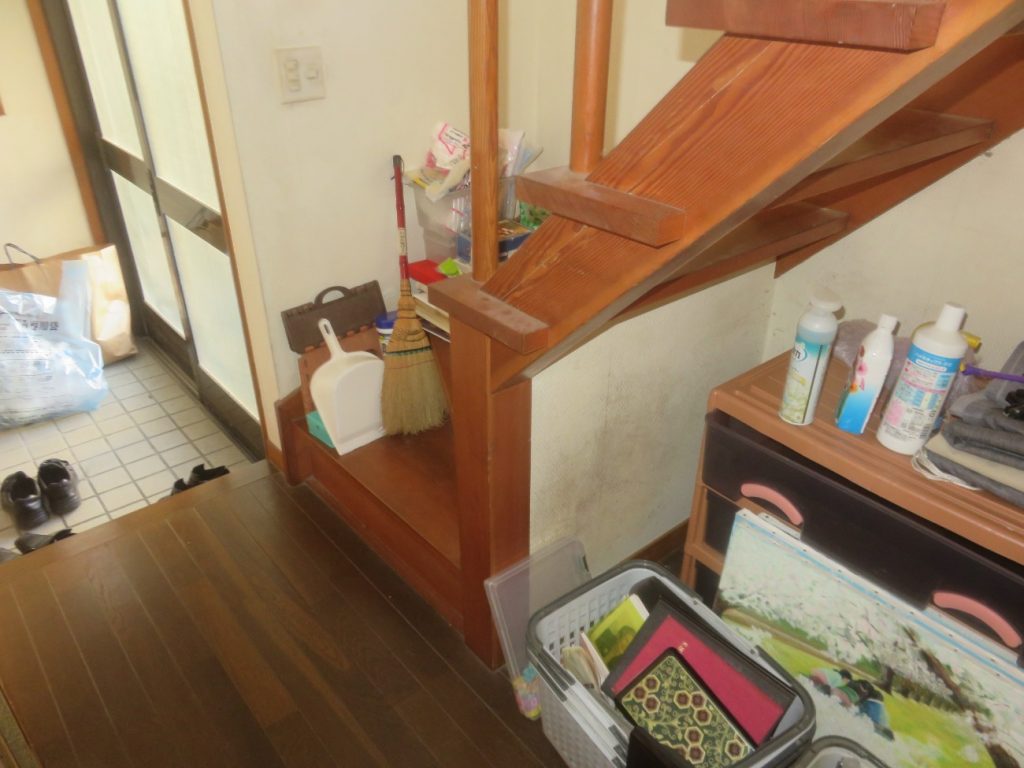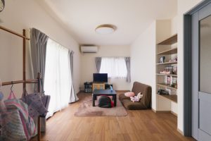 リビング一角に設けた可動棚スペースは元々は玄関側からアクセスする収納でした。