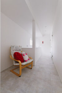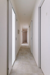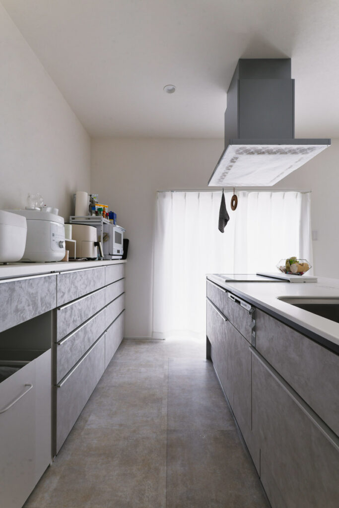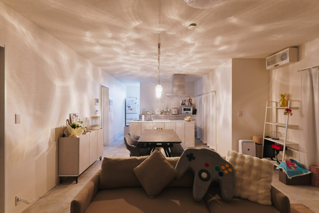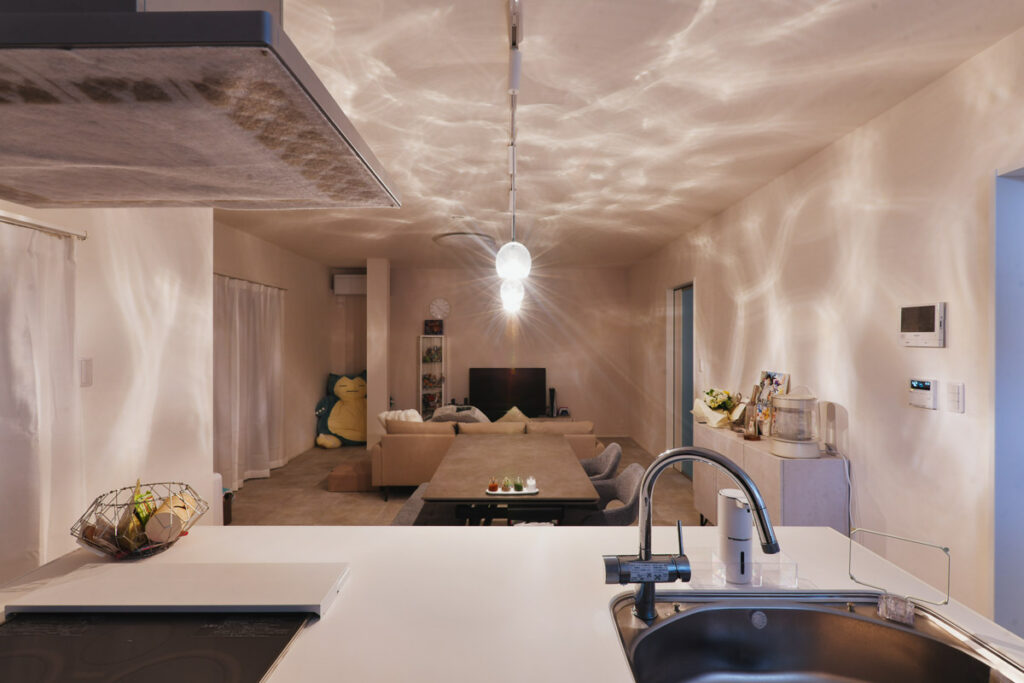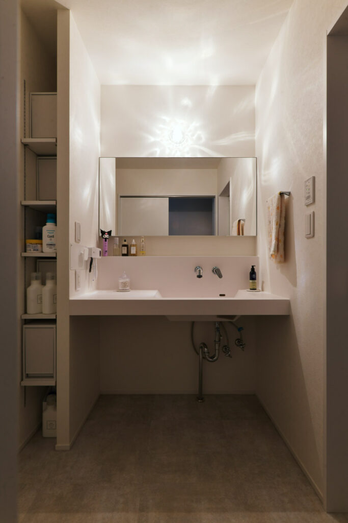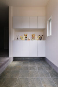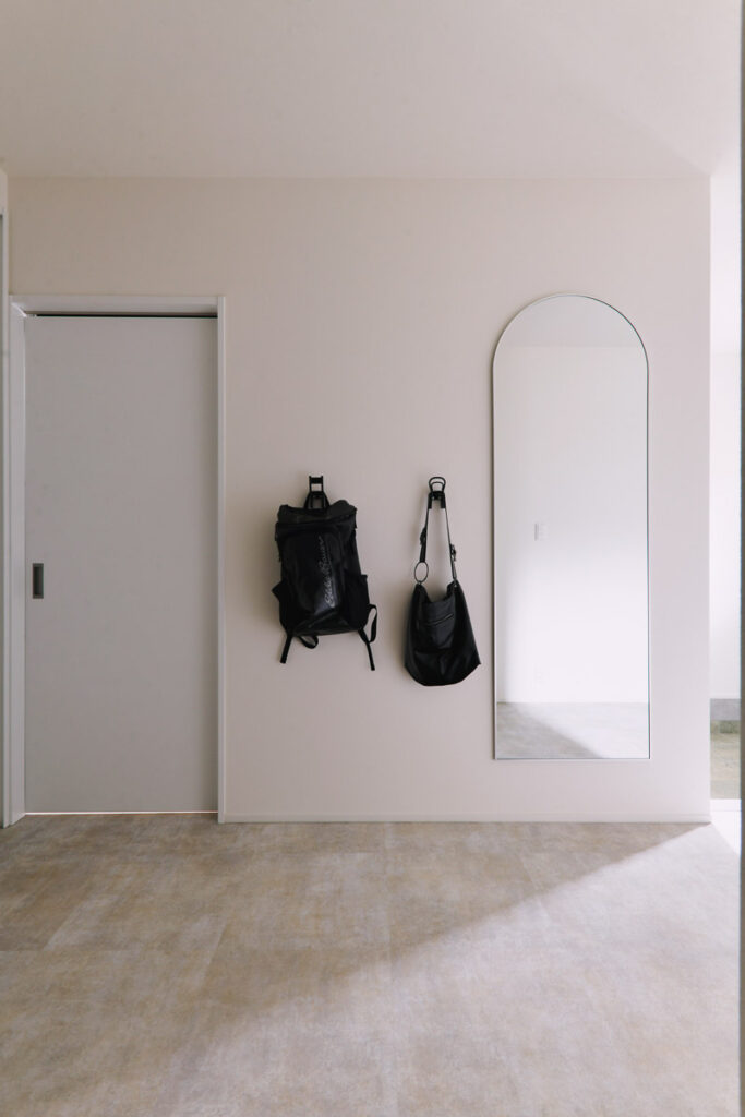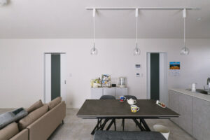 来客が誤ってプライベートスペースに入ってしまわないよう、玄関の位置を大胆に移動。仕事と生活の空間を分ける「職住分離」の間取りを実現し、メリハリのある生活を叶えました。