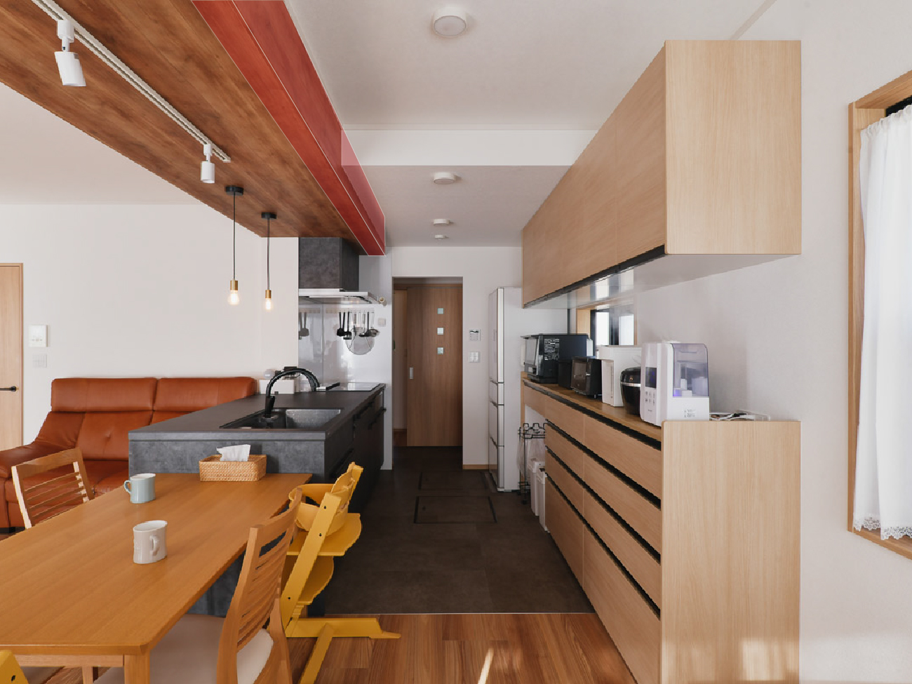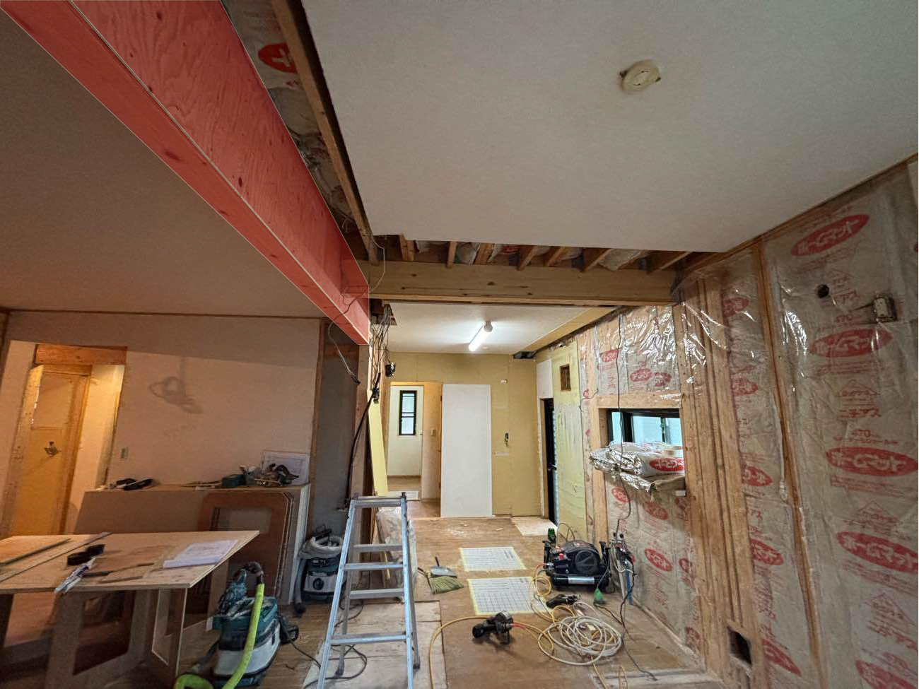 赤く囲んだ部分が高さ36cmある梁補強部分 。壁を抜くことができるのは、この大きな梁のおかげです。梁が目立たないように、キッチン部分の天井を下げて、木目のクロスでアクセントにしています。