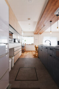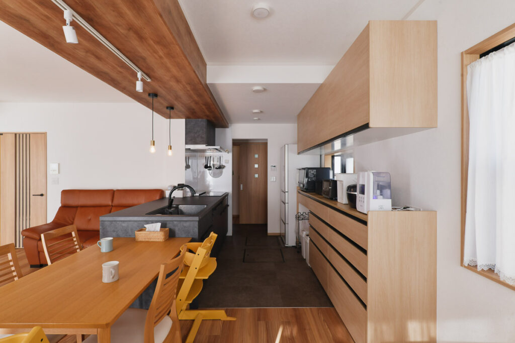 ご夫婦が育休をとられているタイミングということもあり、ご夫婦でじっくりと素材やサンプルを見比べ、悩まれた際にはご相談いただきながら、ひとつひとつ丁寧に決めていくことができました 。デザイン性はもちろん、パントリーの配置や大容量食洗機の導入など、これからの子育てを見据えた実用性の高さも素晴らしいお住まいです 。