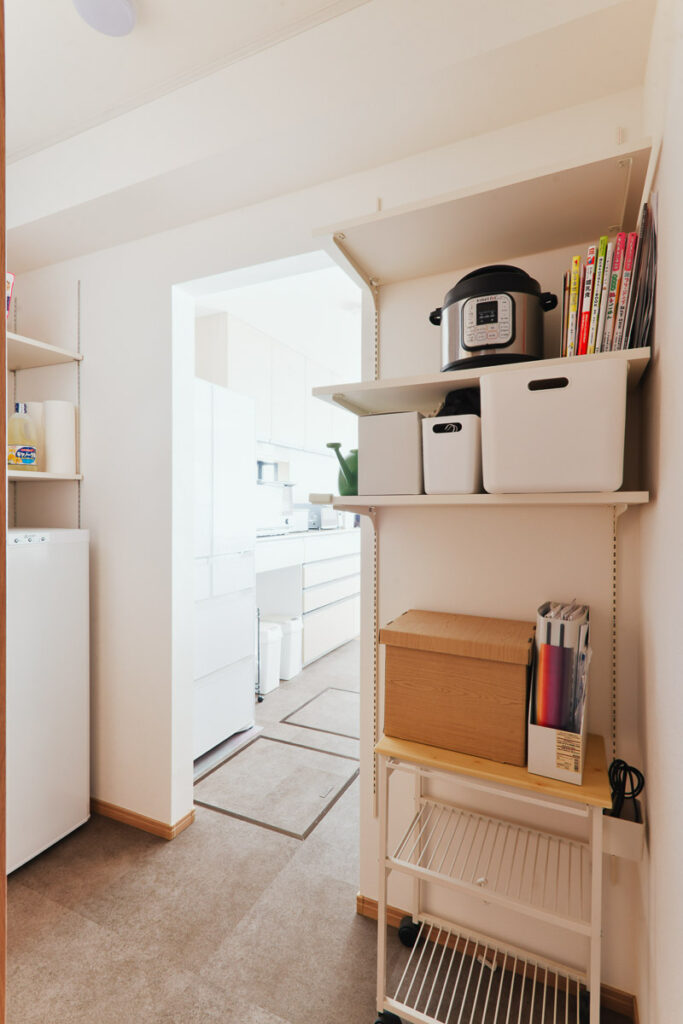 ストック品やサブ冷蔵庫。まとめた段ボールなどをパントリーに置くことで、キッチンをいつでもすっきりと使えるようになりました。キッチンからパントリー、廊下とぐるぐる回れる回遊動線です。