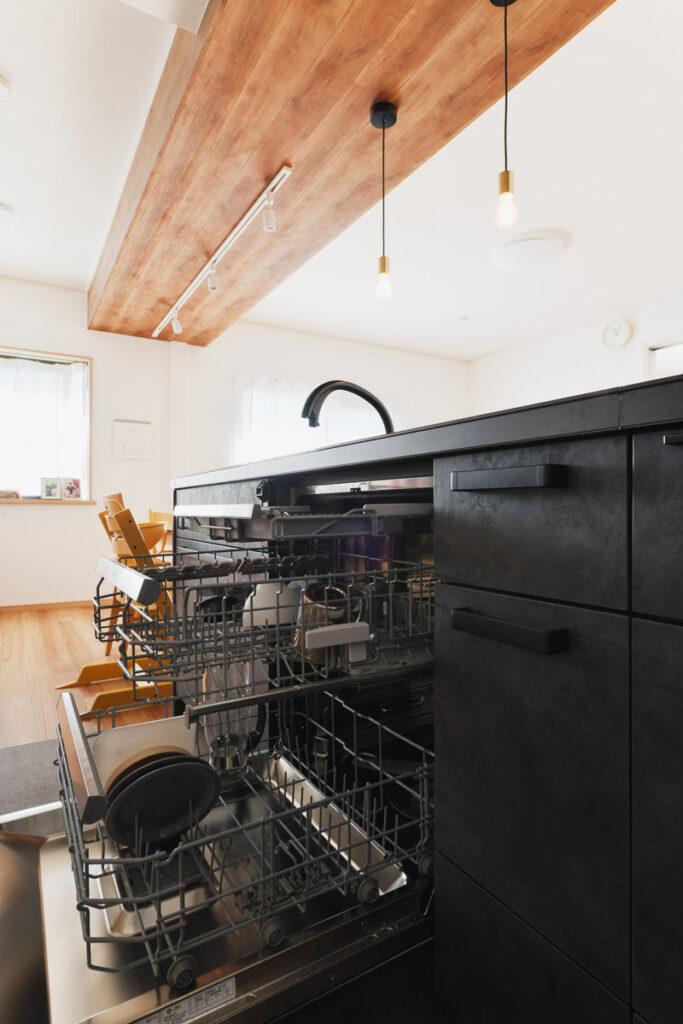 対面キッチンの奥行きを広げたことで調理の準備がスムーズになったのも嬉しいポイント。パナソニックの3段の大きな食洗機は、家族4人分の朝・昼・晩の食器を一度にまとめて洗えるので本当に助かっています。と奥様にも大好評でした。