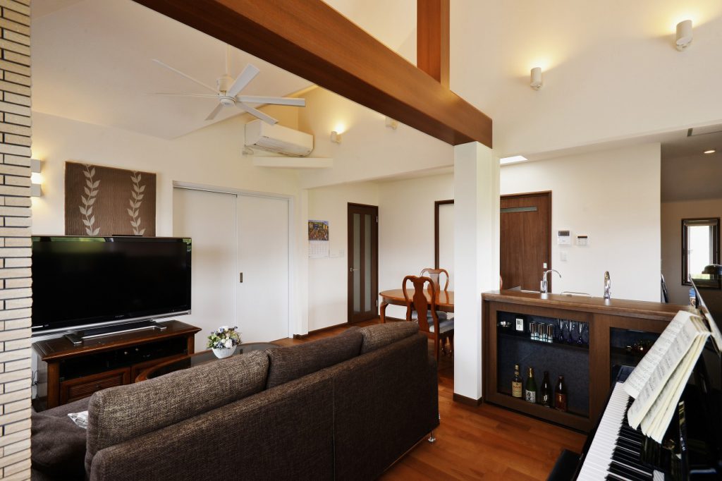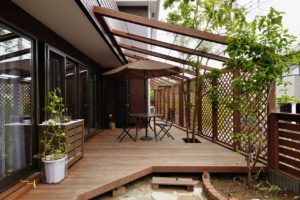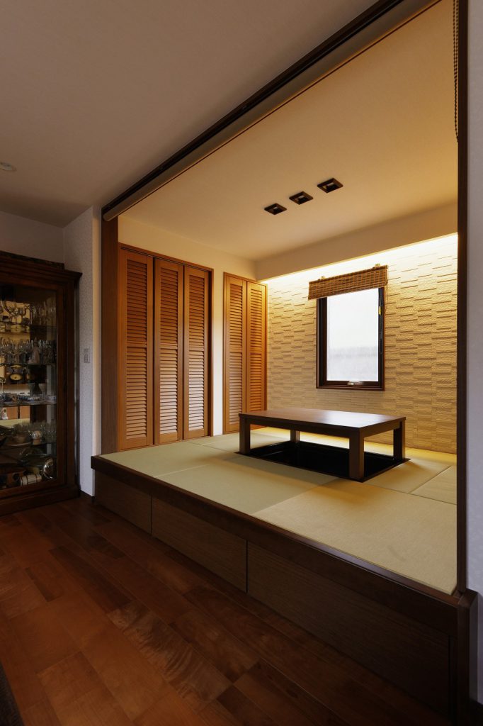 友人や近くにお住いの家族を呼んでホームパーティーをするのが大好きで、多いときは30人ほども集まるそうです。そのため、ウッドデッキまでを意識したオープンリビングを可能にする全開口サッシを取付け、開放的な空間を実現。ヒメシャラの木の真正面にキッチンを配置しました。それに繋がる和スペースは掘りごたつにもなり、収納としても機能します。