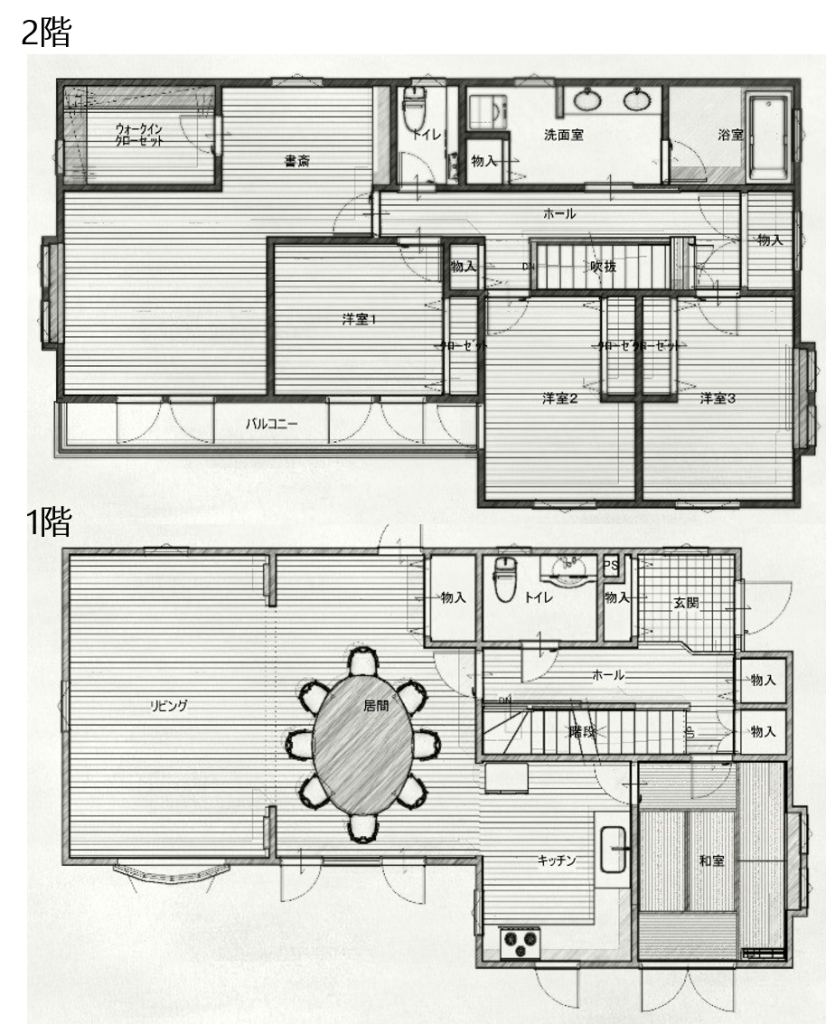 1階を親世帯、2階を子世帯が使用し、玄関のみ共有、水廻りはそれぞれの階に設置としました。