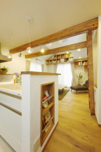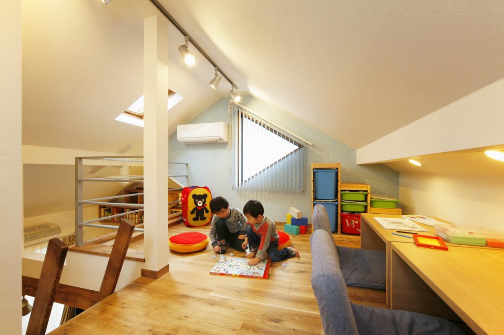「置き家具がなく家族4人が広々と住める家」がお客様のご希望でしたので、48㎡の限られた空間を有効活用できるよう壁の上部に本棚を造作し、大きなクローゼットも設けました。