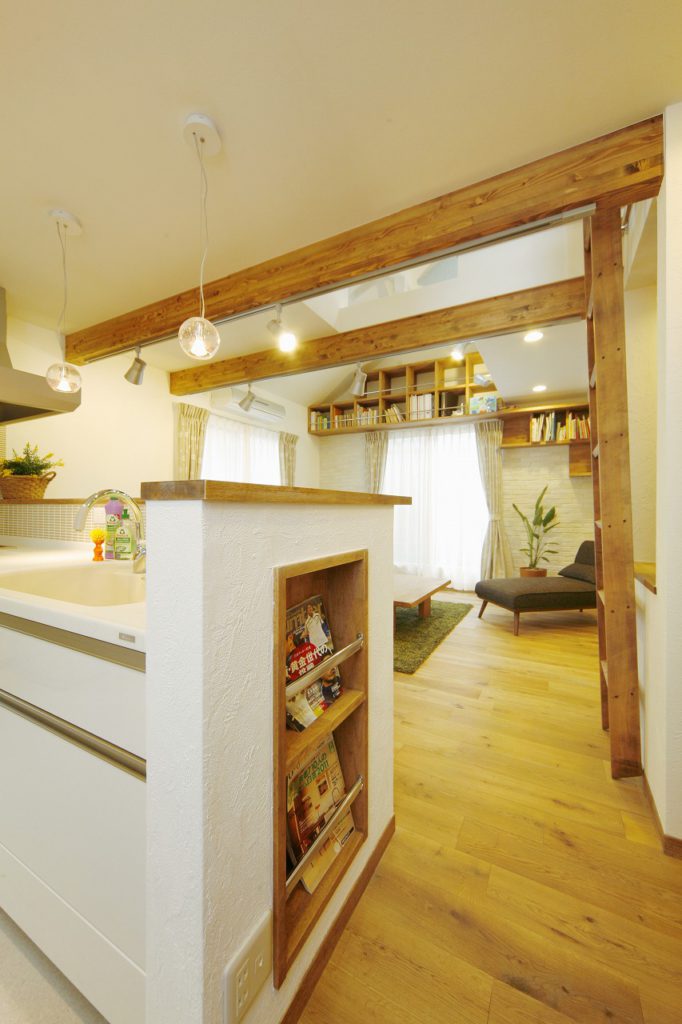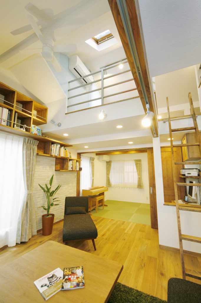 ロフトは拡張して2人の子供部屋に。拡張したロフトを支えるパイン無垢の梁が、リビングにアクセントを加えています。