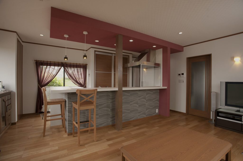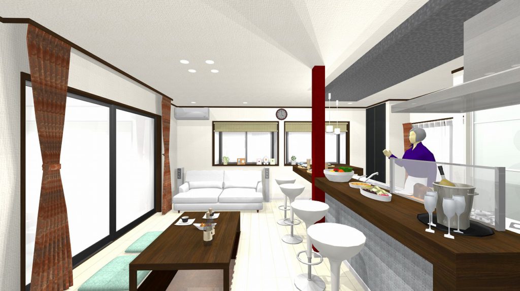 構造的に抜けない柱は木目調の化粧柱とし、空間のアクセントに仕上げました。食器棚と家電収納は天井までの扉を取り付け、閉めてしまえばすっきりとしたお部屋のイメージを保てます。