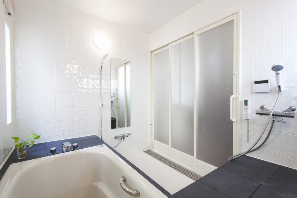 ご主人様が車椅子をご利用されておりますので、段差の解消や使いやすさにこだわり、浴槽位置やそれに伴うタイルの納まり、リモコン位置や水栓位置など、ミリメートル単位まで細かく設計段階からご相談を重ねました。