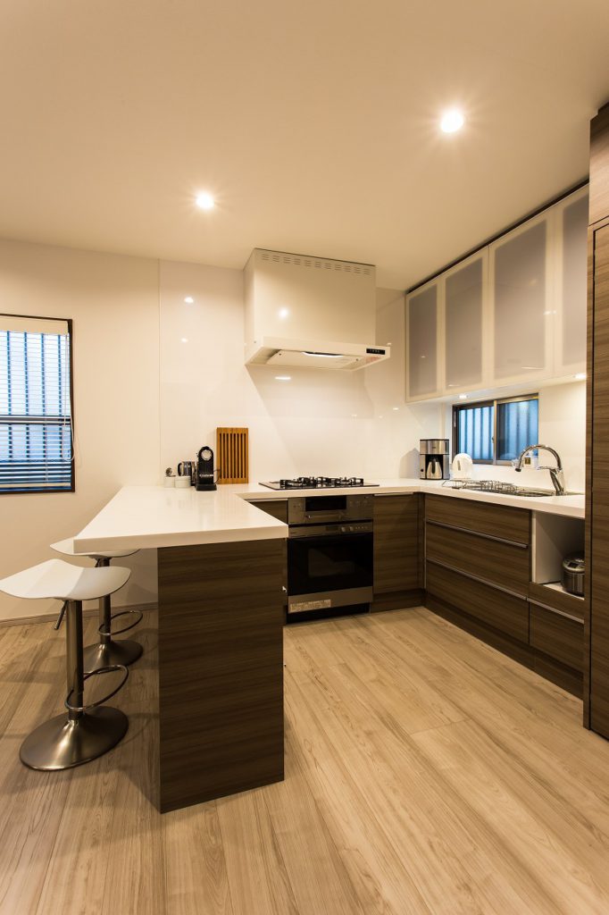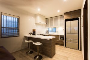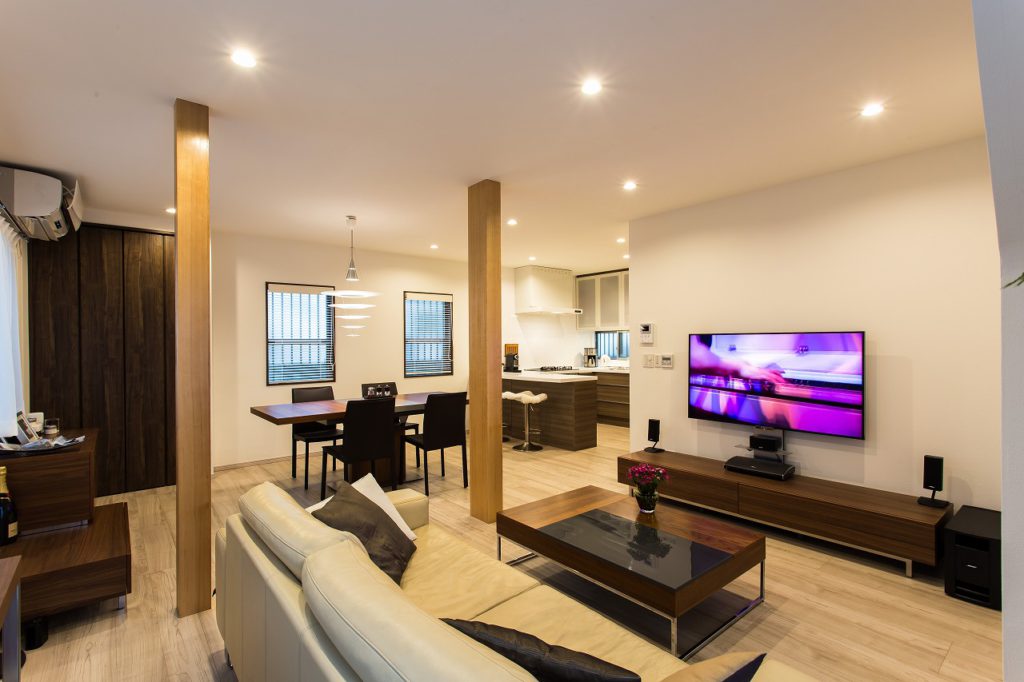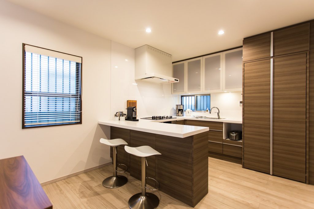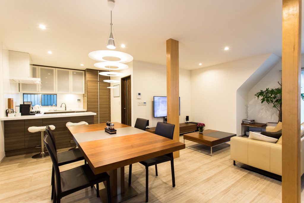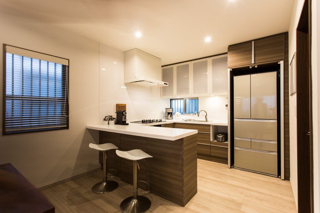 特にキッチンはこだわり、コの字型のオープンタイプにしました。家電関係や食器類がすべて収まるようにし、生活感のでやすい冷蔵庫見えないようにキッチンと同じ面材の扉をつけ隠せるようにしました。 DKと和室と洋室の3部屋をつなげたので、天井床壁をすべて落とし断熱材を入れ天井や床のレベルを調整してすっきりとしたLDKに生まれ変わりました。部屋の中央に残った柱は化粧をして残し、アクセントになっています。