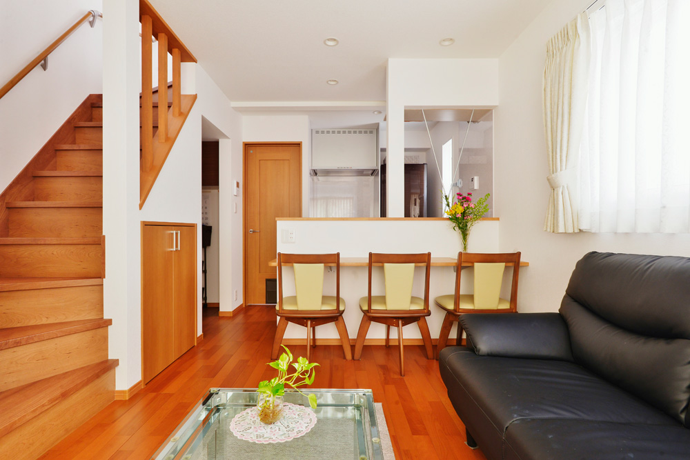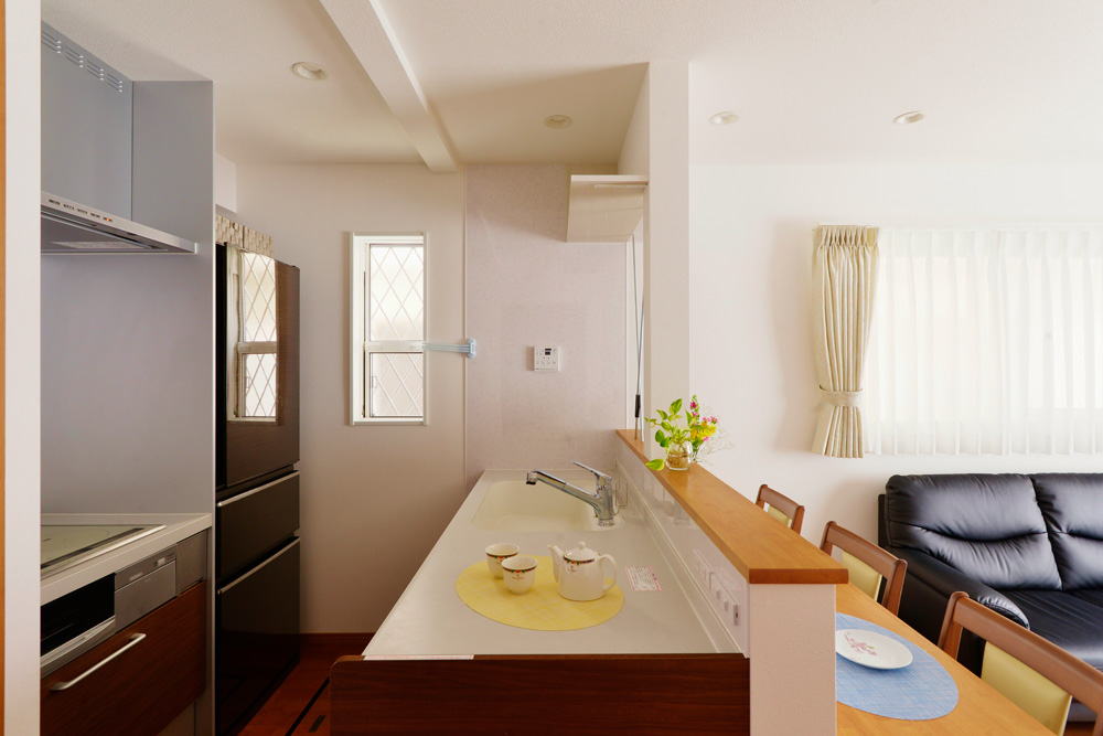 ①キッチンが奥に配置されているので、リビングの中に取り込みたい