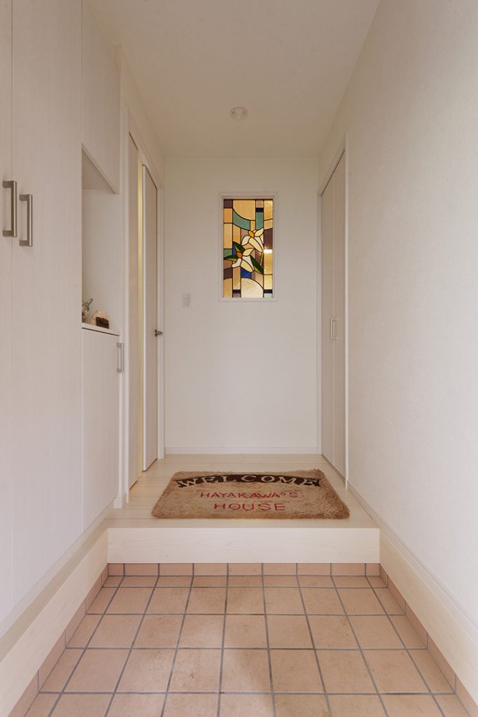 お客様ご本人も住まわれていたお家、何か思い出を残せないかと洗濯機置き場にあったステンドグラスに思い出がないか聞いてみました。実はお母様が昔手作りで作られたとのこと。お母様も年に何度か戻られるということだったのでこれだと思い、玄関に入ったらまずステンドグラスが出迎えてくれるように提案しました。解体工事中に割れたらいけないので工事前に自分で外しに行きました。