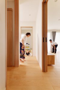 お家は広いけれど、育児しながら家事がしづらい間取りで、農家と子育て、どちらも両立できるようにしたいというご要望。1Fから2Fに収穫した野菜等を運ぶことの出来る昇降リフト等、普通の家では無いものもあり、既存を活かしつつ、家事も育児も仕事もしやすい家が理想。